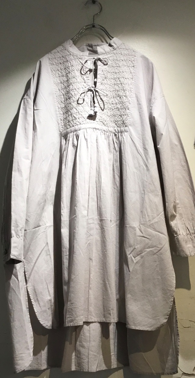 maison de soilの刺繍チュニックが入荷しました さりげない華やかさを放つ手振りの刺繍はコンピューターミシンではなく 人の手で布を動かしながら絵を描くように表現され 職人さんの技術の高さと手仕事による温もりを感じられる贅沢な一品です 裾がラウンドしたロングテール仕様のシャツは ばさっと被るだけでもサマになり ヒップ部分をカバーしてくれる安心感のある着丈も嬉しいポイントですね ※手洗い可能です サイズ② 身幅 63㎝ 着丈 90㎝ 裄丈 75㎝ 素材 コットン100% カラー ライトグレー インド製