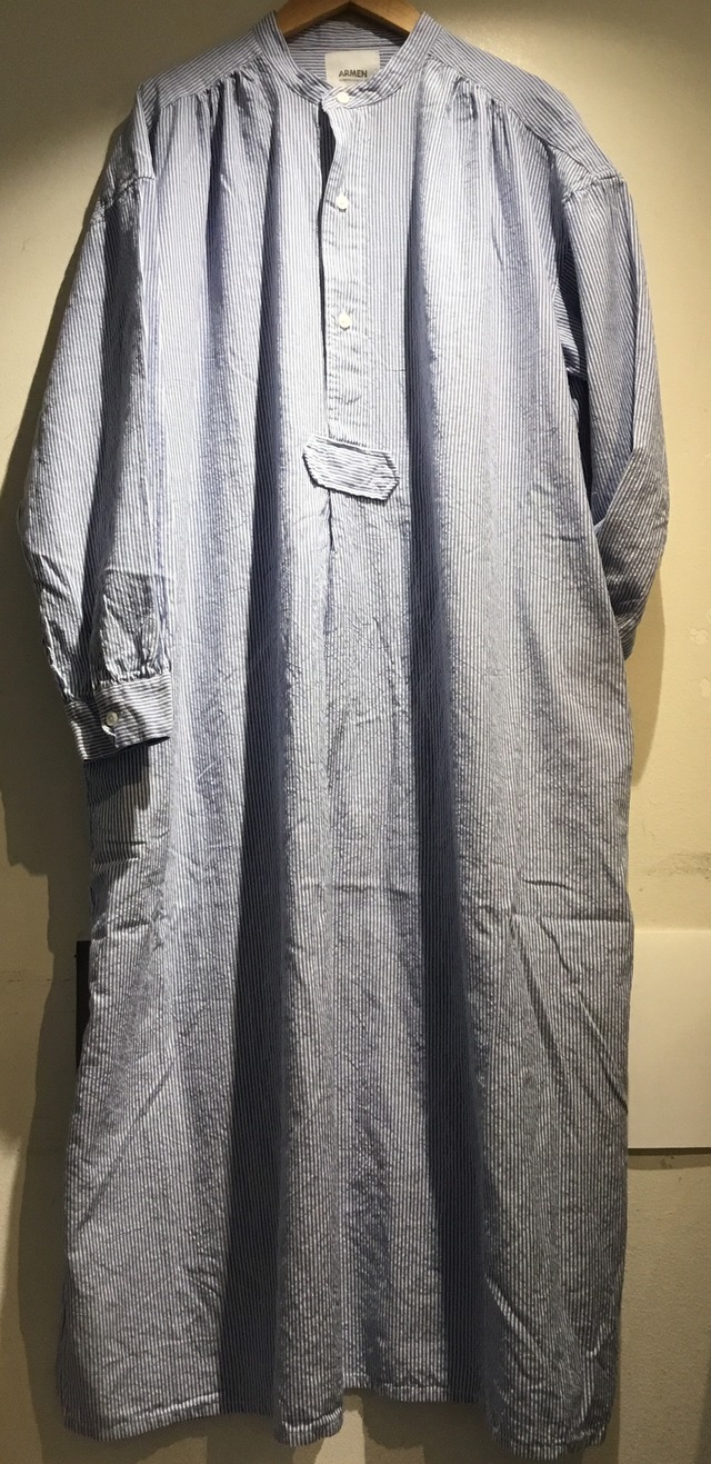レディース ARMENよりワークギャザードレスが入荷致しました。 ストライプが優しい印象になっています。肌触りも大変良いコットン100%素材です。毎日着たくなるドレスです。 ※ご自宅でお洗濯可能です サイズ:② 着丈:118㎝、身幅:68㎝ 裄丈:81㎝ サイドにスリットあります。 素材:コットン100% カラー:ブルーストライプ インド製です