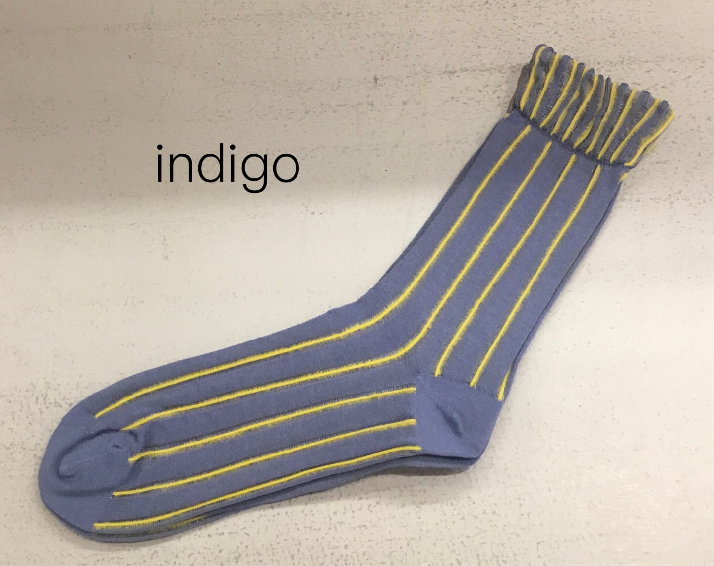 コットンベースにストライプをテグスで透けさせたシアーソックス。すり硝子の質感の様なマットさと配色がポイントです。