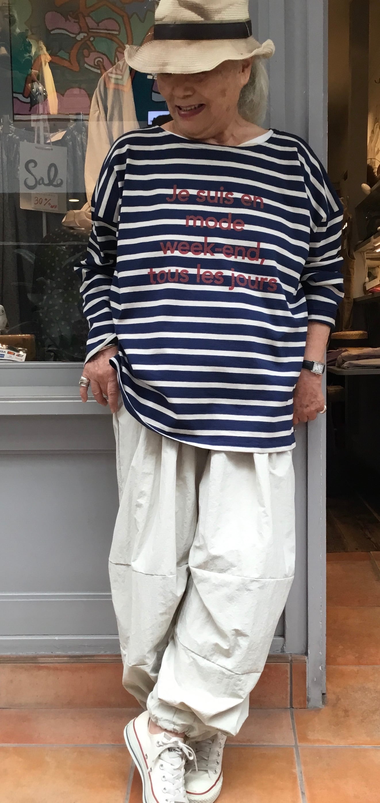 ドロップショルダーにゆったりとしたシルエットです。ボートネックなのでストールやシャツなどと合わせ、さまざまなコーディネイトを楽しんで頂けます。
