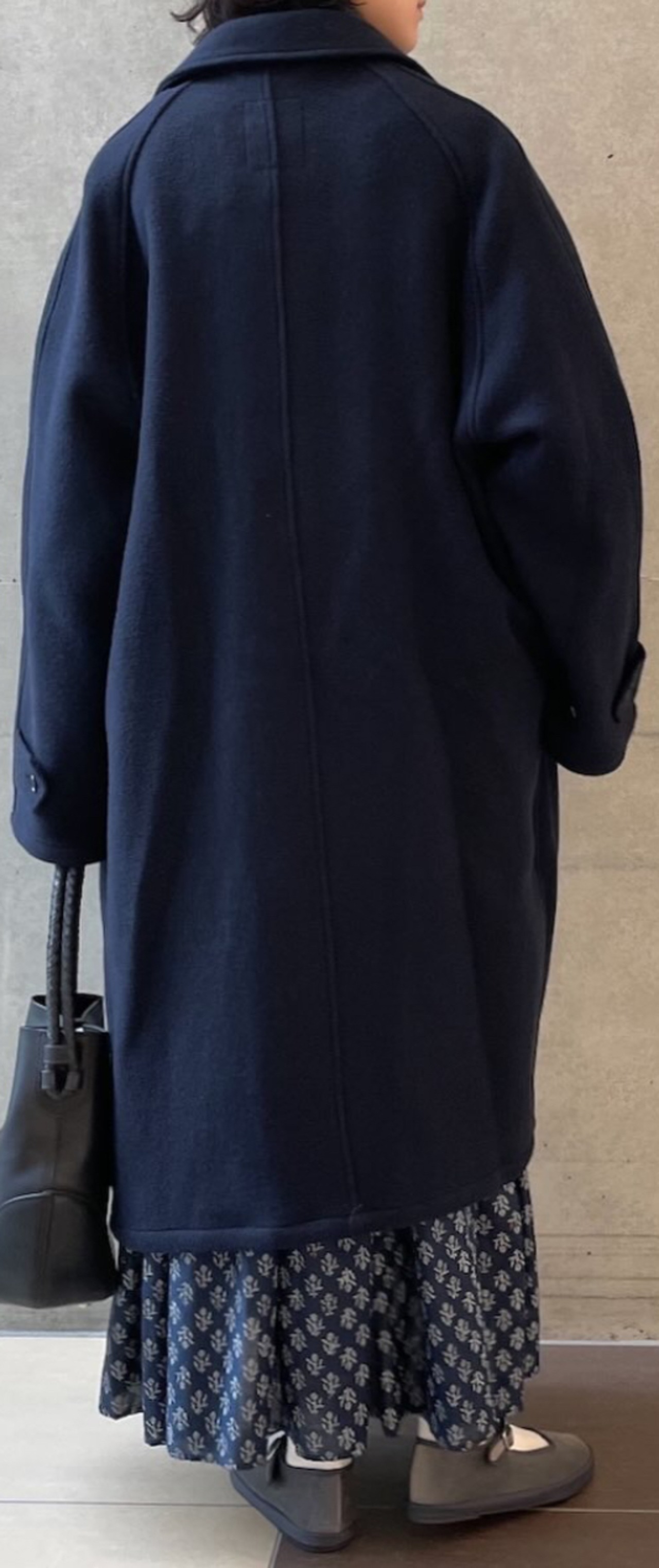 比翼仕立てのシンプルなフロントデザインに、着丈の長いオーバーサイズ気味のAラインシルエット。