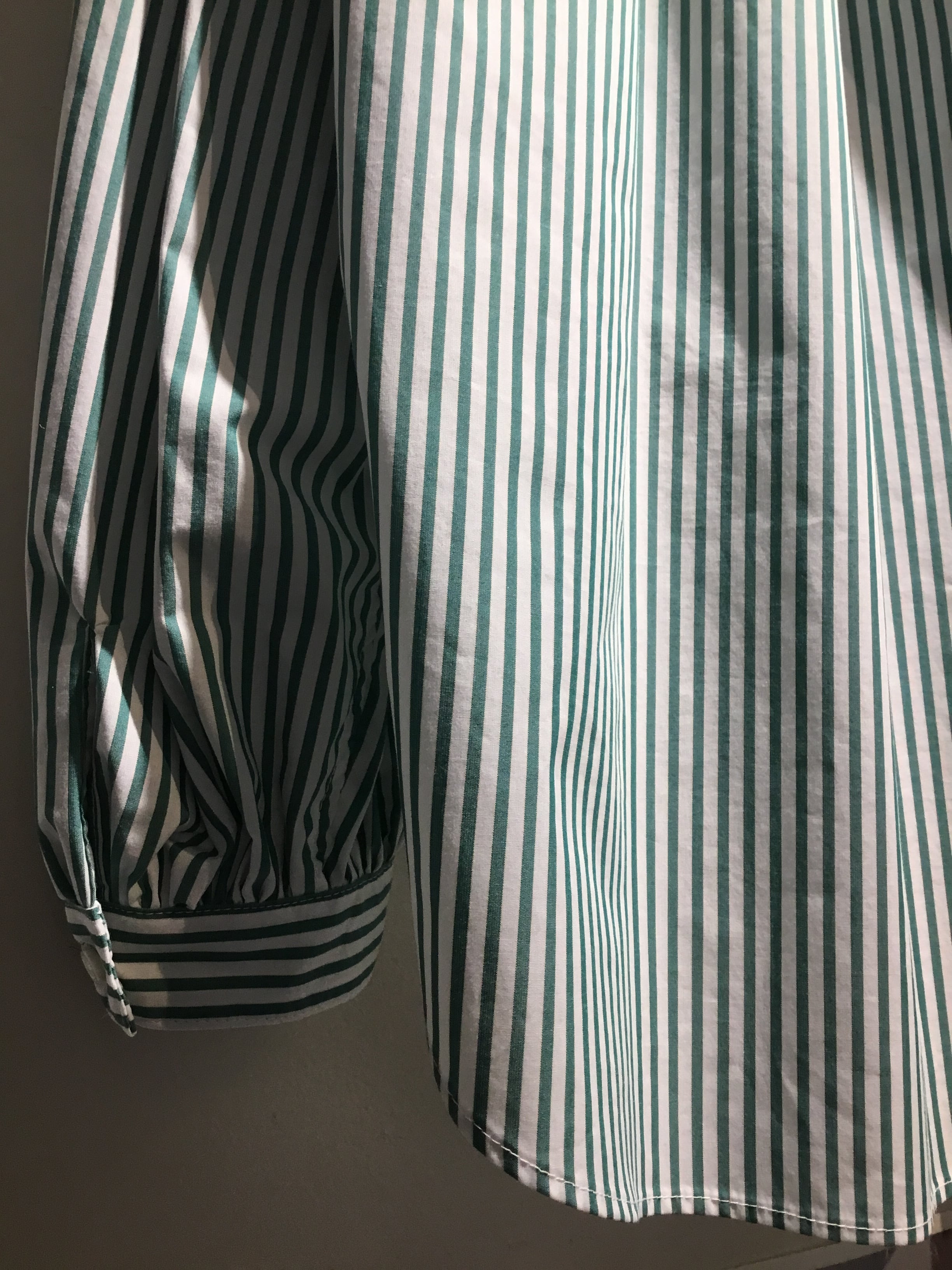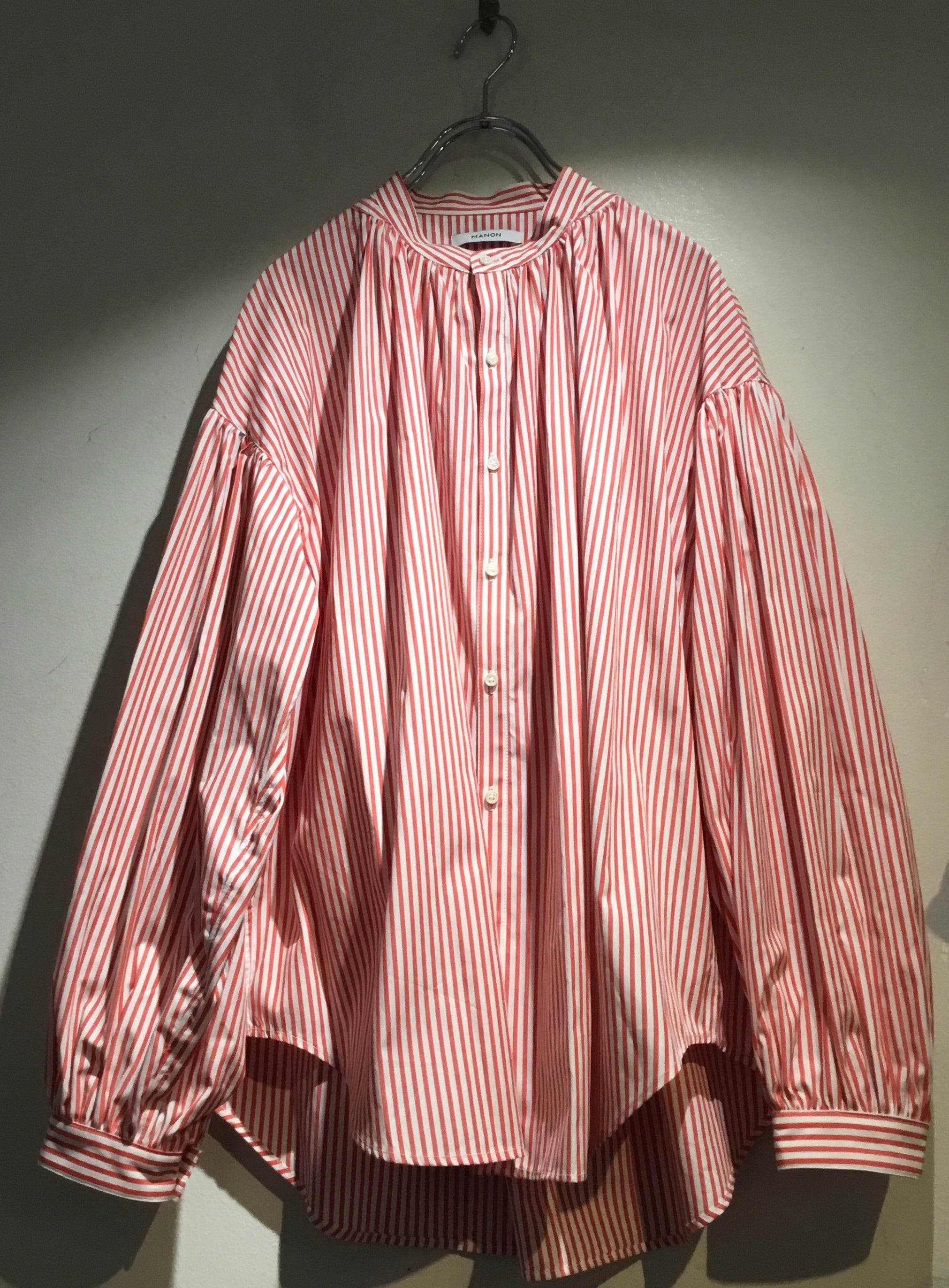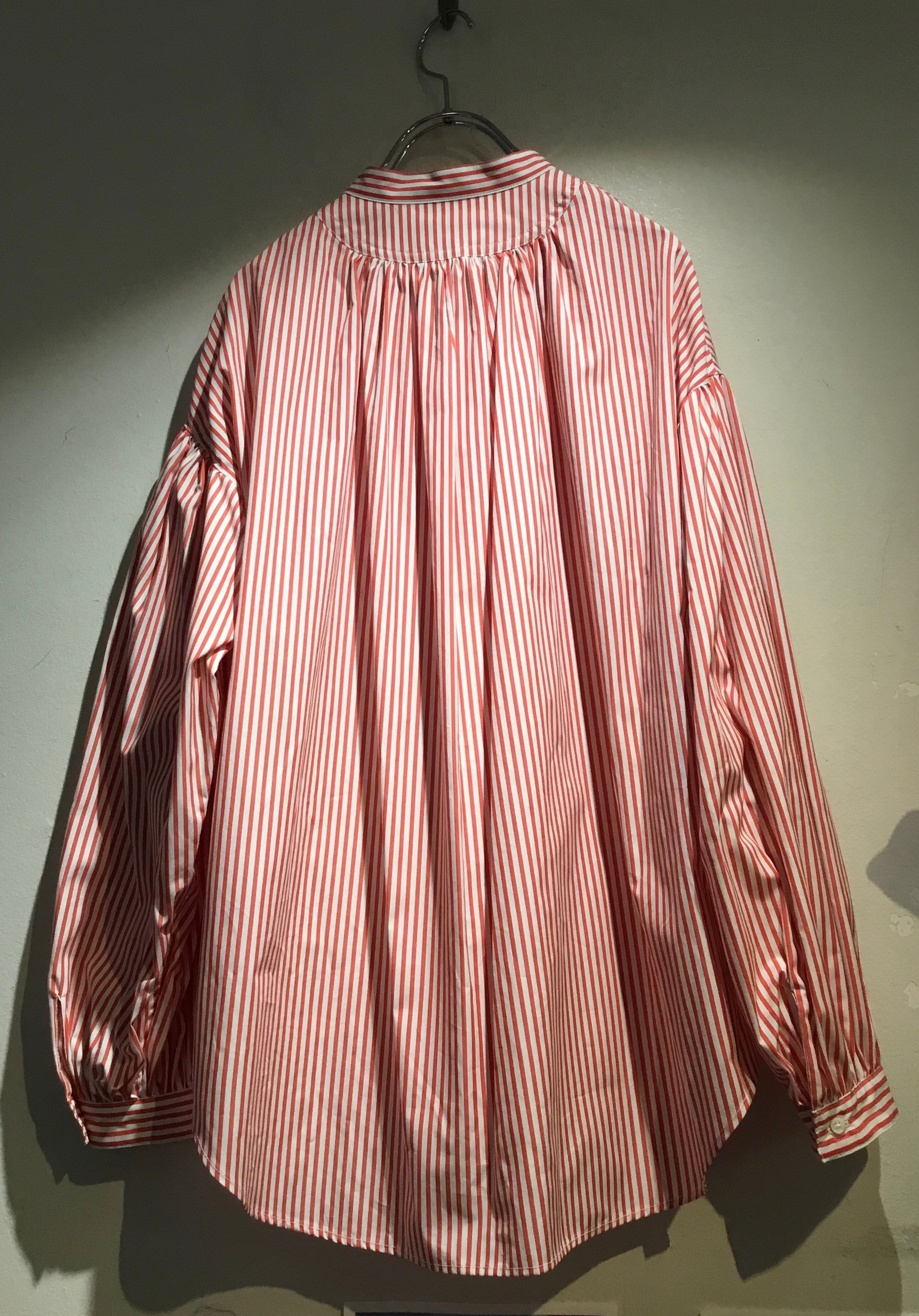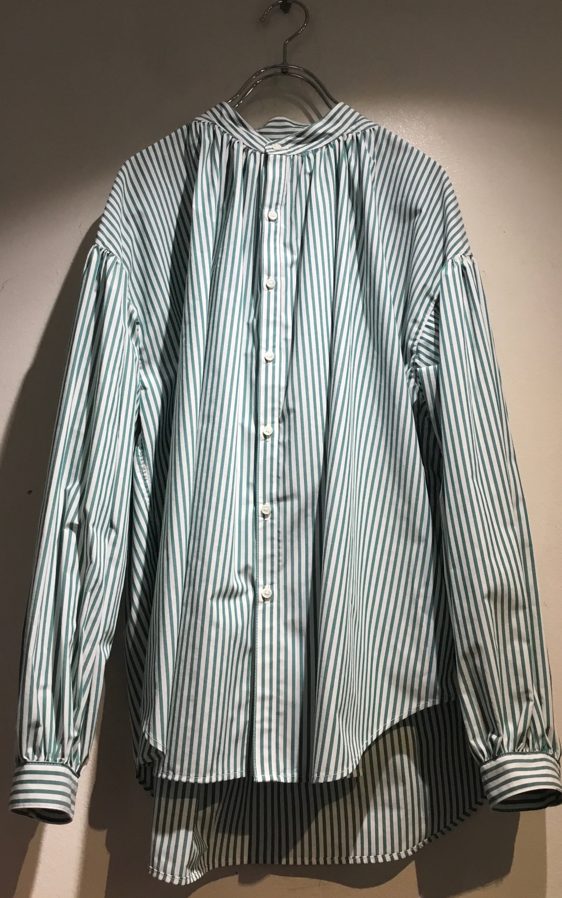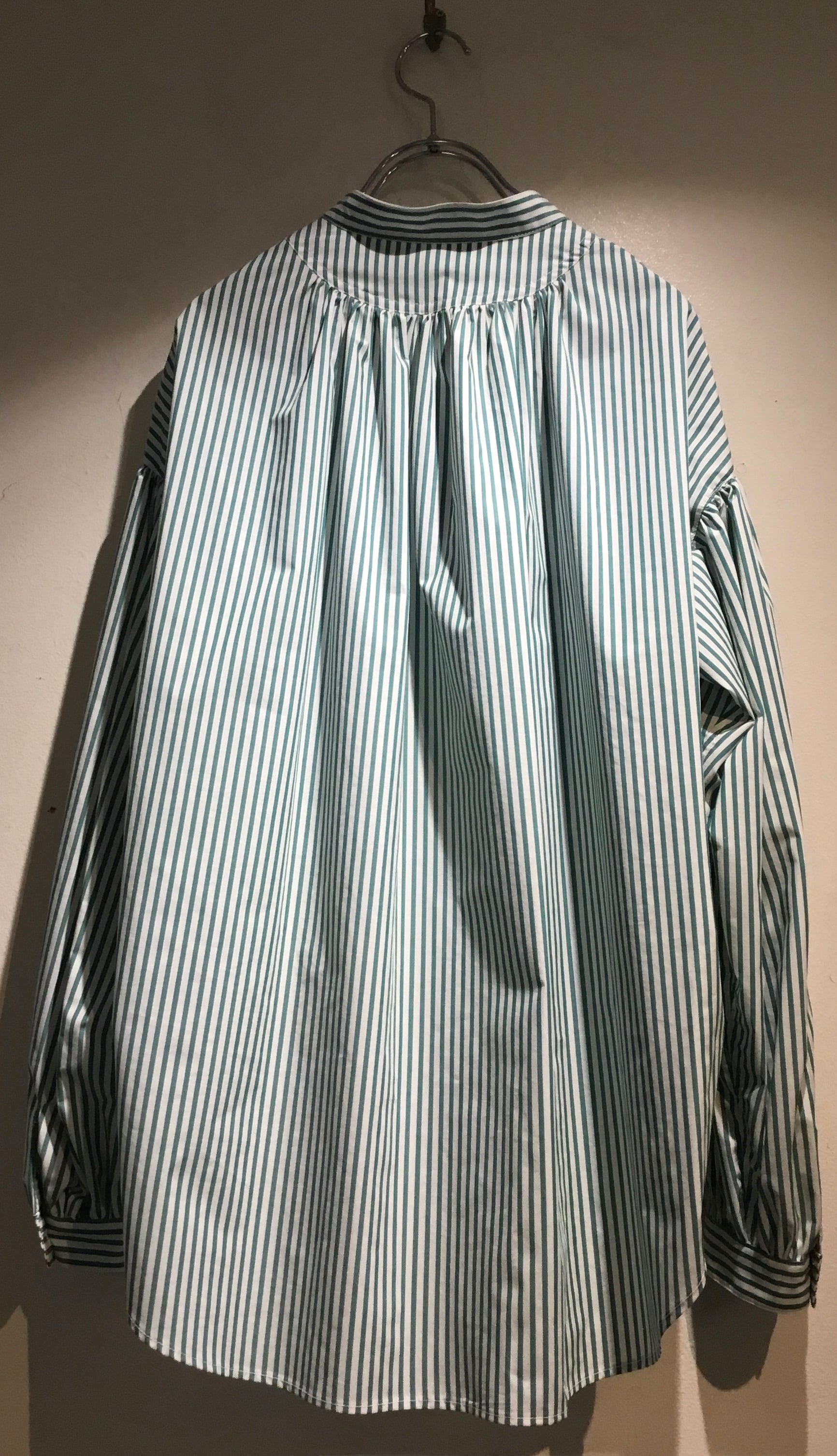 衿はバンドカラーで 肩を落とし 衿周りから後ヨーク 袖口にたっぷりとギャザーを入れた柔らかな膨らみのあるシルエットのシャツ 毎シーズン大変人気のシャツです